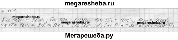 114. Выразите в граммах: 8 кг 600 г; 5 кг 30 г; 1 кг 15 г; 14 кг; 3 ц 12 кг 500 г; 2 ц 3 кг 50 г.