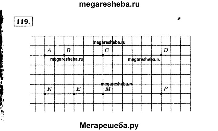 119. Начертите координатный луч и отметьте на нём точки: а) А(0), B(1), С(3), D(6), если единичный отрезок равен 1 см; б) K(0), £(1), М(2), Р(4), если единичный отрезок равен длине трёх клеток тетради.
