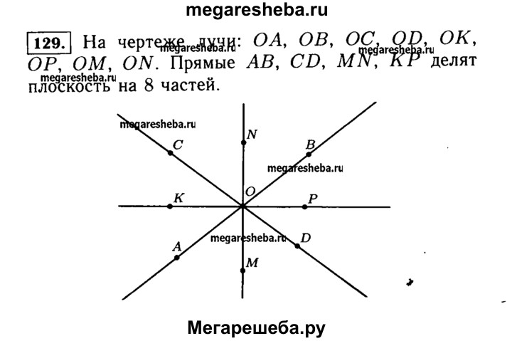 129. Начертите прямые АВ, CD, MN и КР, которые пересекаются в одной точке О. Назовите все лучи, получившиеся на чертеже. На сколько частей прямые АВ, CD, MN и КР делят плоскость?