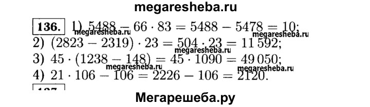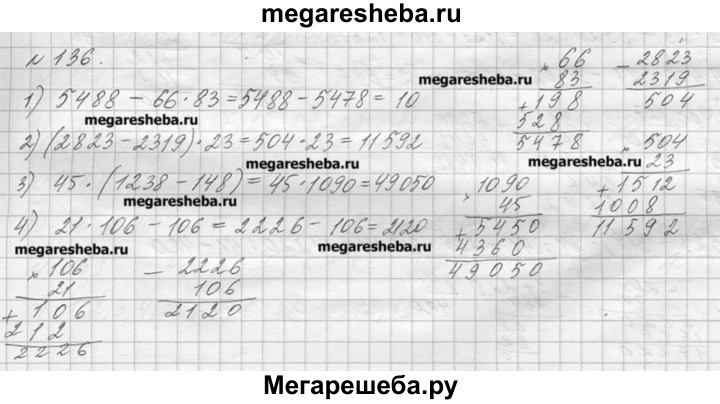 136. Выполните действия: 1)5488- 66*83; 3) 45 * (1238 - 148); 2)(2823 - 2319) * 23; 4)21*106 - 106.