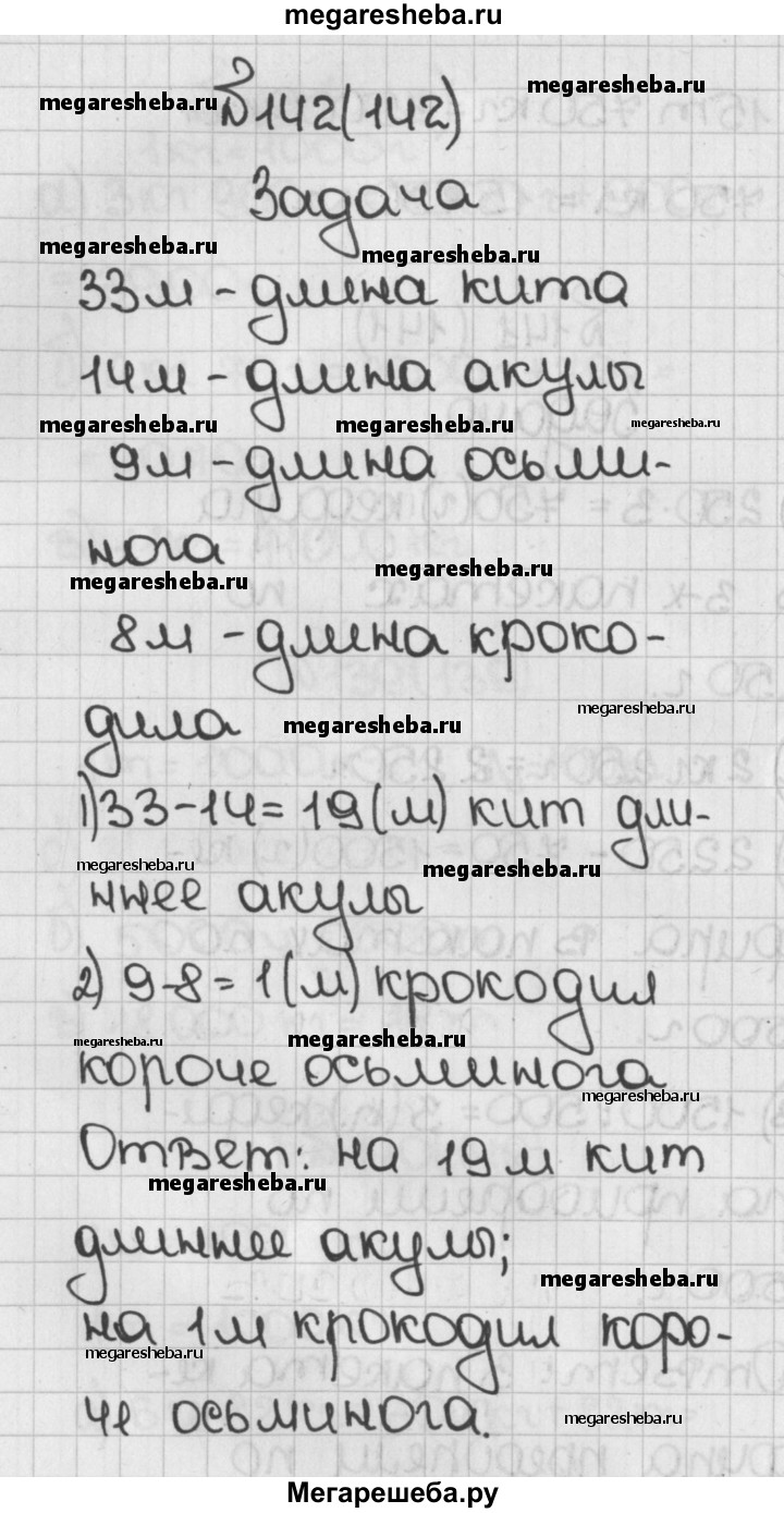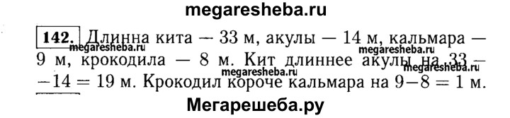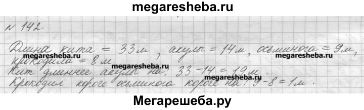 142. Найдите длину каждого животного по рисунку 27. На сколько метров кит длиннее акулы? На сколько метров крокодил короче осьминога? Одно деление шкалы — 1м.