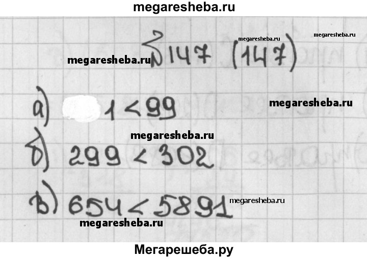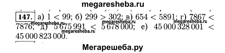 147. Выясните, какое из двух чисел меньше, и запишите ответ с помощью знака <: а) 1 или 99; г) 7867 или 7876; б) 302 или 299; д) 5 678 000 или 5 675 991; в) 5891 или 654; е) 45 000 823 000 или 45 000 328 001. Прочитайте получившиеся неравенства.