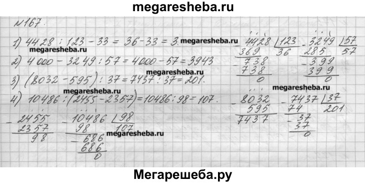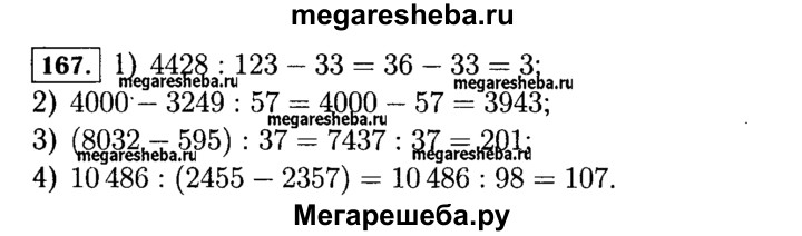 167. Выполните действия: 1) 4428 : 123 - 33; 3)(8032 - 595): 37; 2) 4000 - 3249 : 57; 4) 10 486 : (2455 - 2357).