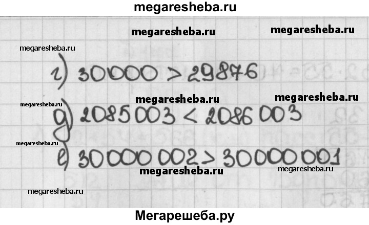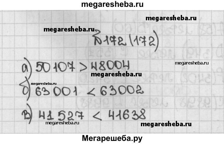 172. Сравните числа и поставьте вместо звёздочки знак < или знак >: а) 50 107 * 48 004; г) 30 000 * 29 876; б) 63 001 * 63 002; д) 2 085 003 * 2 086 003; в) 41 527 * 41 638; е) 30 000 002 *30 000 001.