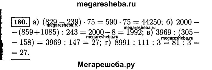 180. Выполните действия: а) (829 - 239) * 75; в) 3969 : (305 - 158); б) 2000 - (859 + 1085) : 243; г) 8991 : 111 : 3.