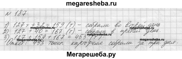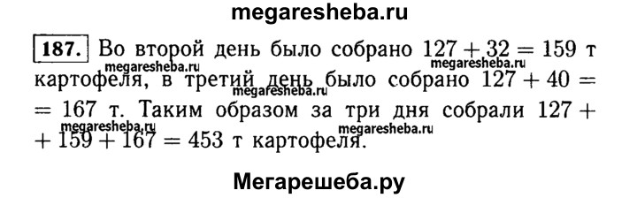 187. В первый день собрали 127 т картофеля, что на 32 т меньше, чем во второй день. В третий день собрано на 40 т больше, чем в первый день. Сколько всего тонн картофеля было собрано за эти три дня?