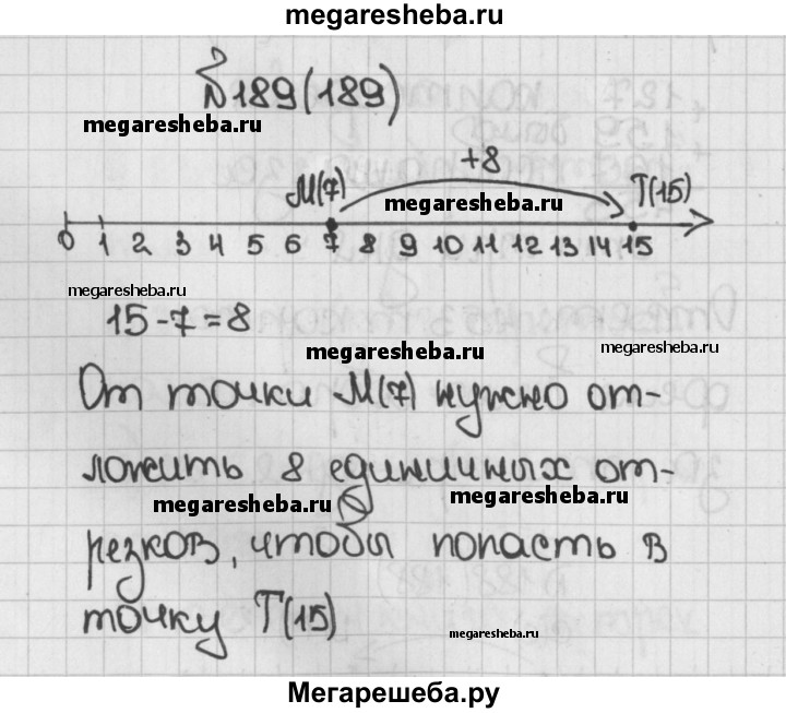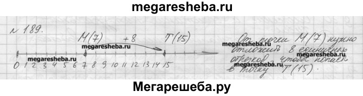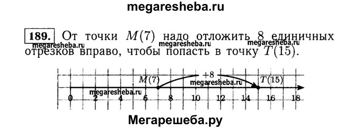 189. Начертите координатный луч и отметьте на нём точки М(7) и Т(15). Сколько единичных отрезков надо отложить от точки М ив какую сторону, чтобы попасть в точку T?