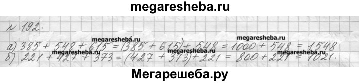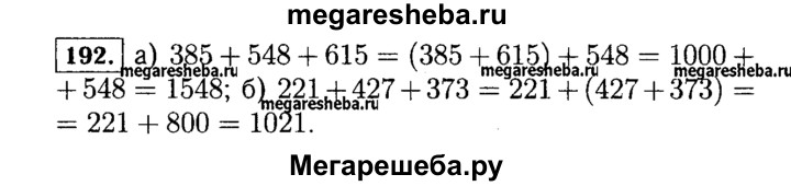 192. Вычислите сумму, выбирая удобный порядок выполнения действий: а) 385 + 548 + 615; б) 221 + 427 + 373.