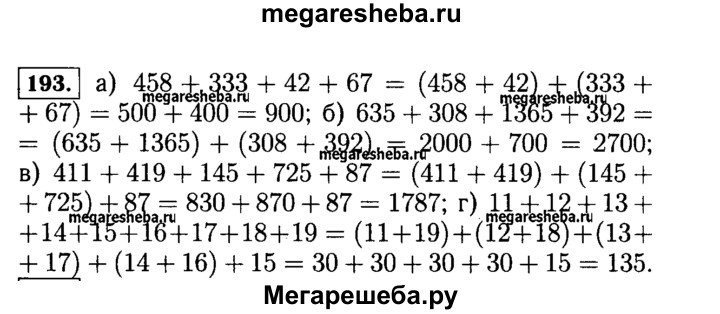 193. Вычислите: а) 458 + 333 + 42 + 67; б) 635 + 308 + 1365 + 392; в) 411 + 419 + 145 + 725 + 87; г) 11 + 12 + 13 + 14 + 15 + 16 + 17 + 18 + 19.