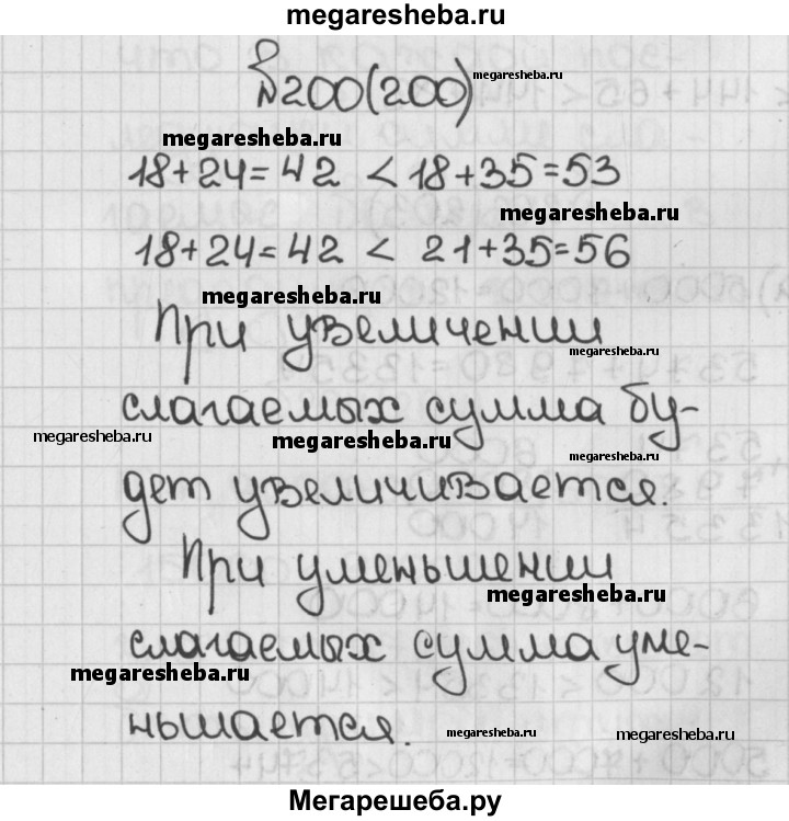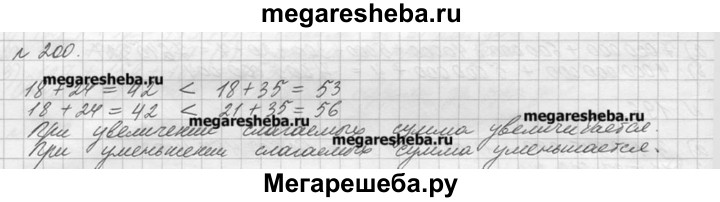 200. Какая из сумм — 18 + 24 или 18 + 35 — больше? Какая из сумм 18 + 24 или 21 + 35 — больше? Что происходит с суммой при увеличении слагаемых? А при их уменьшении?