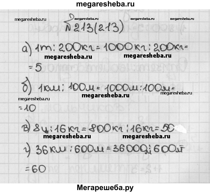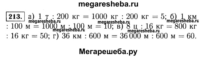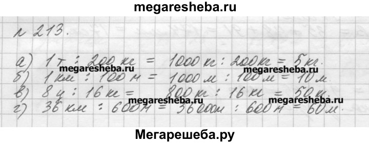 213. Выполните деление: а) 1 т : 200 кг; б) 1 км : 100 м; в) 8 ц : 16 кг; г) 36 км : 600 м.
