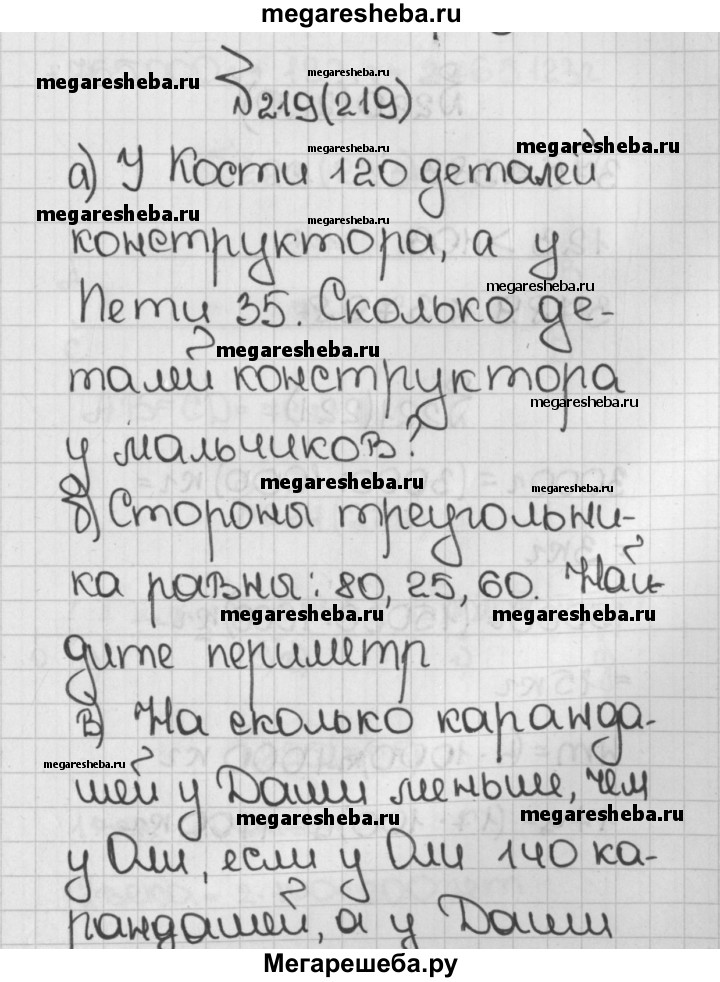 219. Составьте условие задачи, которая решается с помощью выражения: а) 120 + 35; 6)80 + 25 + 60; в) 140 - 50; г) 90 - 20 - 45.