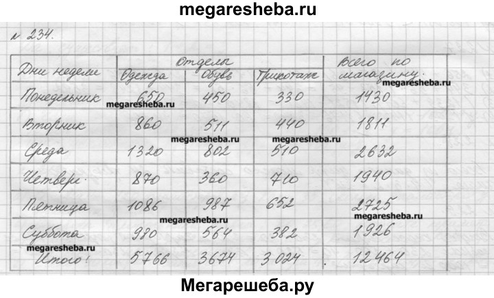 234. Вычислите стоимость товаров (в тыс. рублей), поступивших в отделы магазина за неделю. Такой же расчёт сделайте по всему магазину.
