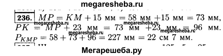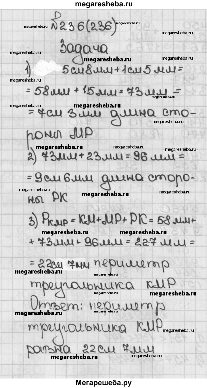 236. Найдите периметр треугольника КМР, если длина стороны КМ равна 5 см 8 мм, сторона MP на 1 см 5 мм длиннее стороны КМ, но короче на 2 см 3 мм стороны РК.