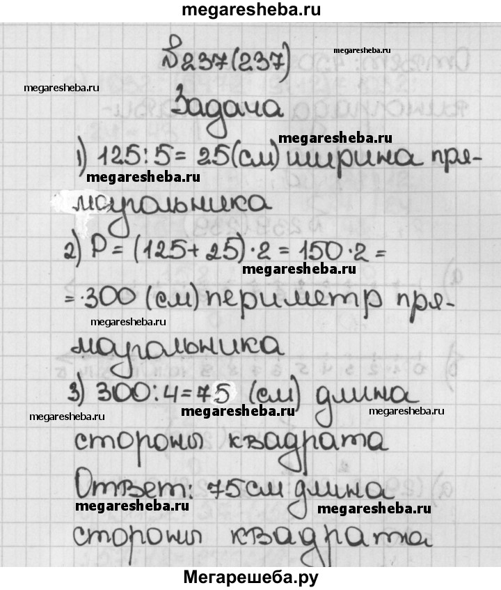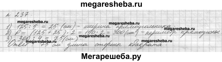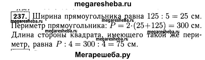 237. Длина прямоугольника 1 м 25 см, а ширина в 5 раз меньше. Найдите длину стороны квадрата, периметр которого равен периметру этого прямоугольника.