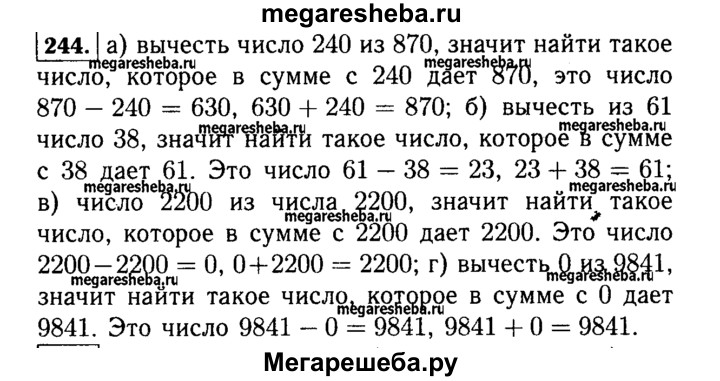 244. Объясните, что значит вычесть: а) число 240 из числа 870; в) число 2200 из числа 2200; б) из числа 61 число 38; г) число 0 из числа 9841.