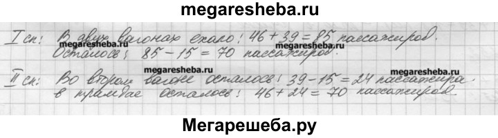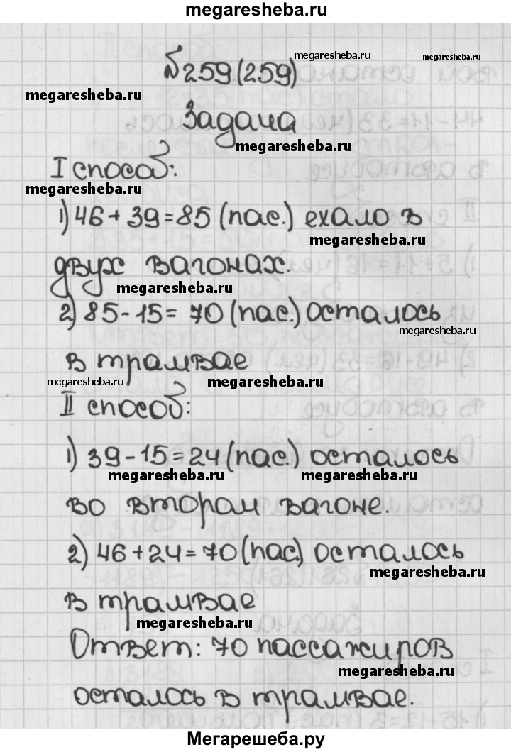 259. В первом вагоне трамвая ехали 46 пассажиров, а во втором — 39 пассажиров. На остановке из второго вагона вышли 15 пассажиров. Сколько всего пассажиров осталось в трамвае? Решите задачу двумя способами.