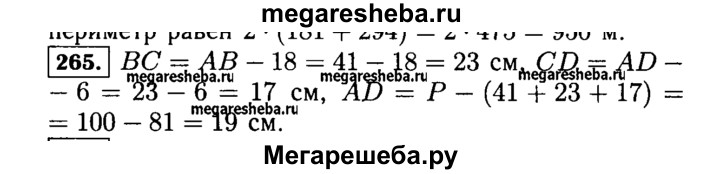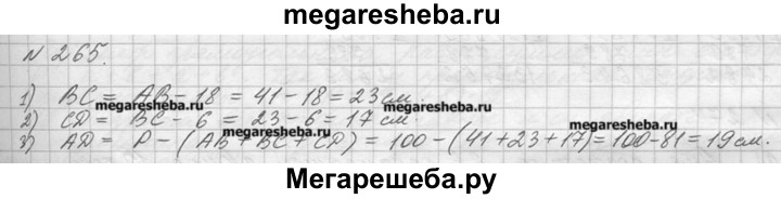265. Периметр четырёхугольника ABCD равен 100 см. Сторона АВ равна 41 см, сторона ВС короче стороны АВ на 18 см, но длиннее стороны CD на 6 см. Найдите длину стороны AD.