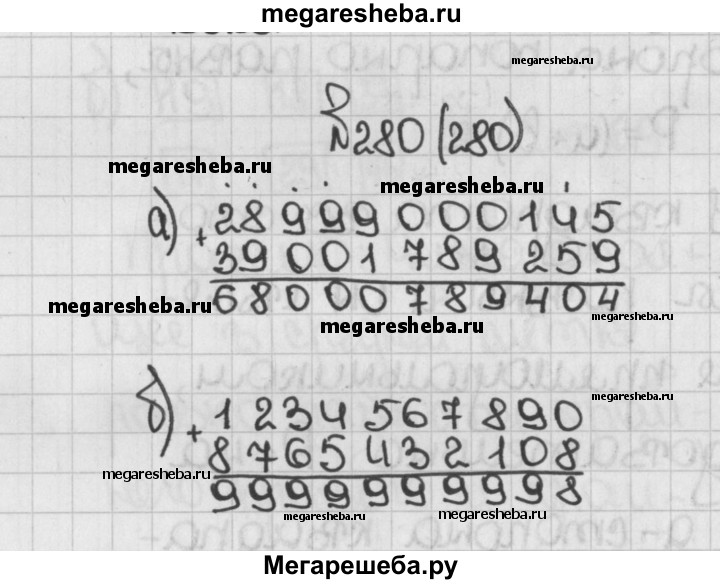 280. Выполните сложение: а) 28 999 000 145 + 39 001 789 259; б) 1 234 567 890 + 8 765 432 108.