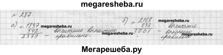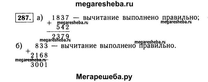 287. Проверьте с помощью сложения, правильно ли выполнено вычитание: а) 2379 - 1837 = 542; б) 3001 - 833 = 2168.