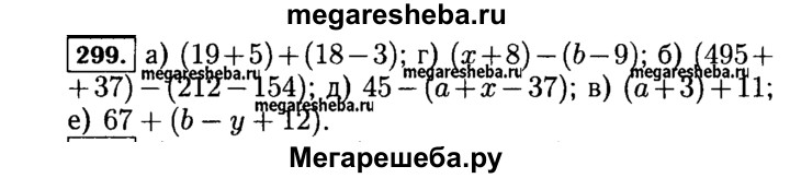299. Запишите выражение: а) сумма 19 + 5 и 18 - 3; г) разность х + 8 и b - 9; б) разность 495 + 37 и 212 - 154; д) разность 45 и а + х - 37; в) сумма а + 3 и 11; е) сумма 67 и b - у + 12.