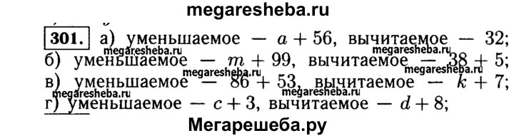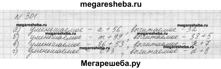 301. Назовите уменьшаемое и вычитаемое в разности: а) (а + 56)'-32; в) (86 + 53) - (k + 7); б) (m + 99) - (38 + 5); г) (с + 3) - (d + 8).