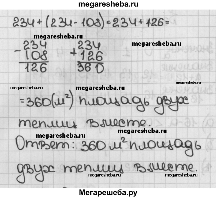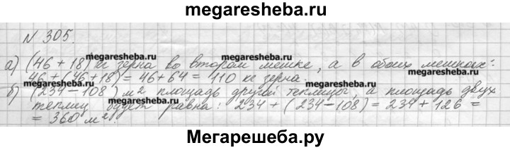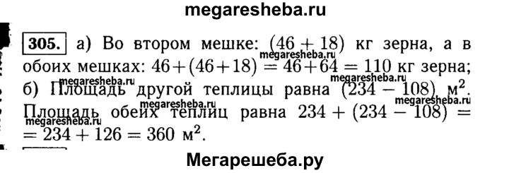 305. Составьте выражение для решения задачи и найдите его значение: а) В одном мешке было 46 кг зерна, что на 18 кг меньше, чем во втором мешке. Сколько килограммов зерна было в обоих мешках вместе? б) Площадь одной теплицы 234 м2, что на 108 м2 больше площади другой. Какова площадь двух теплиц вместе?
