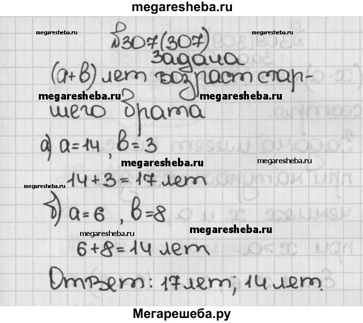 307. Одному брату а лет, а другой брат старше его на b лет. Сколько лет другому брату? Составьте выражение и найдите его значение при: а) а = 14, b = 3; б) а = 6, b = 8.