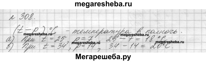 308. В полдень термометр показал температуру t°C, а к полуночи температура опустилась на р°С. Какую температуру показывал термометр в полночь? Составьте выражение и найдите его значение: а) при t = 25, р = 7; б) при t = 34, р = 14.