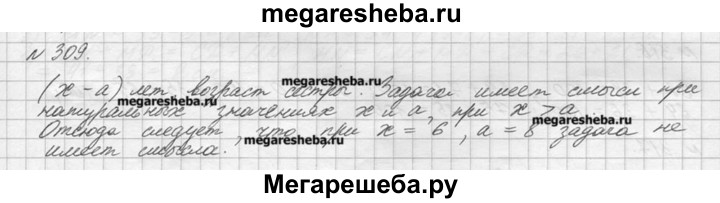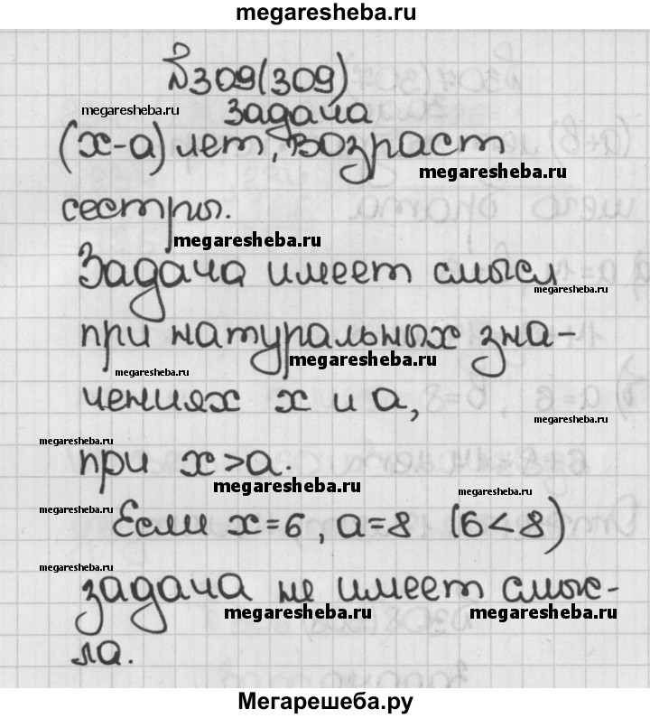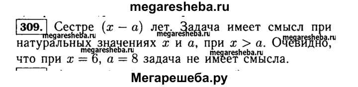 309. Брату х лет, а его сестра на а лет моложе. Сколько лет сестре? При любых ли значениях х и а задача имеет смысл? Имеет ли она смысл, если х = 6, а = 8?