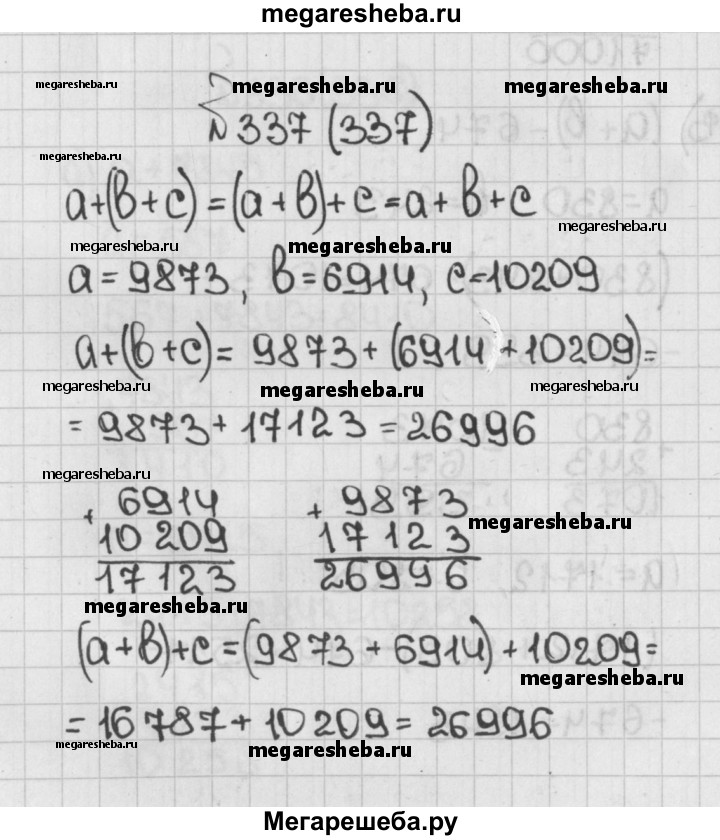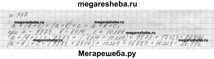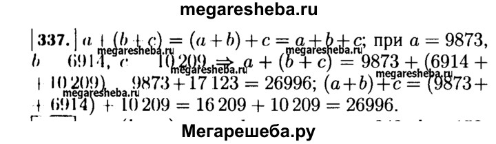 337. Запишите сочетательное свойство сложения с помощью букв a, b и с. Замените буквы их значениями: a = 9873, b = 6914, с = 10209 — и проверьте получившееся числовое равенство.