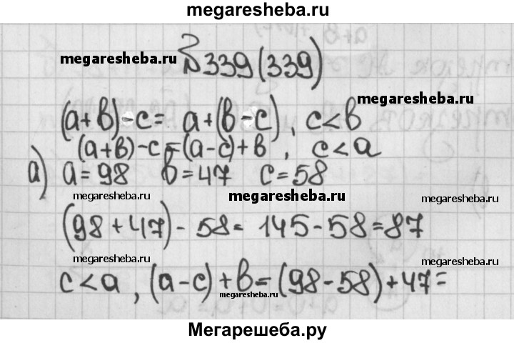 339. Запишите свойство вычитания числа из суммы двумя способами. Проверьте получившиеся числовые равенства, заменив буквы их значениями: a) a = 98, Ь = 47 и с = 58; б) a = 93, b = 97 и с = 95.