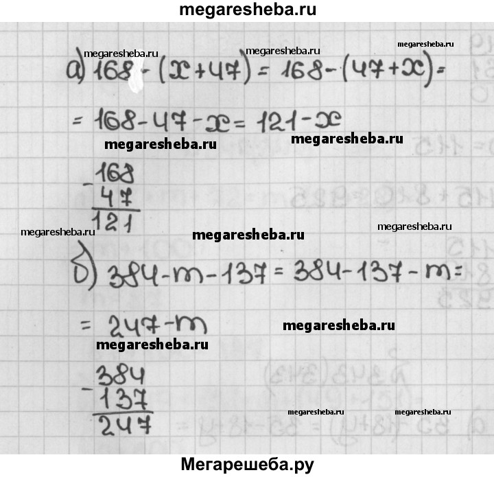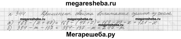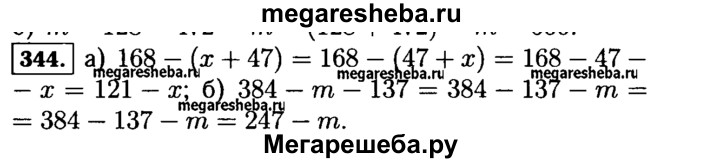 344. Из свойств сложения и вычитания следует: 137 - с - 27 = 137 - (с + 27) = 137 - (27 + с) = = 137 - 27 - с = 110 - с. Какие свойства сложения и вычитания применены в этом примере? Используя эти свойства, упростите выражение: а) 168 - (х + 47); б) 384 - m - 137.