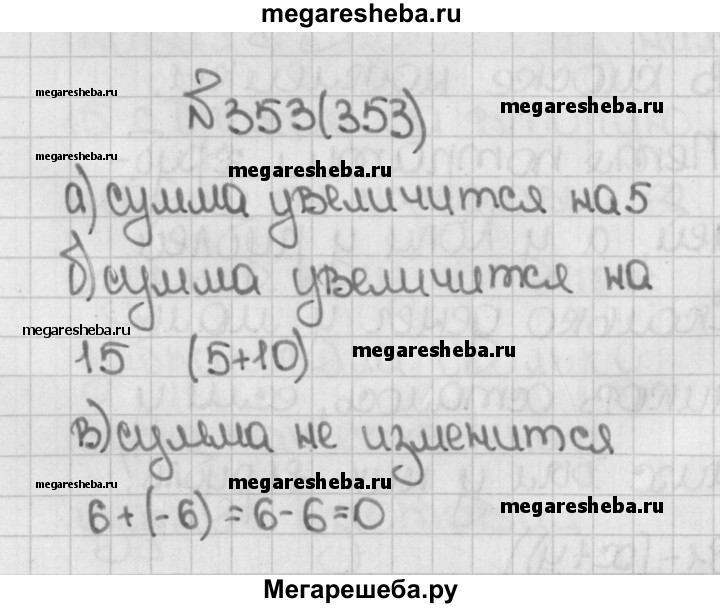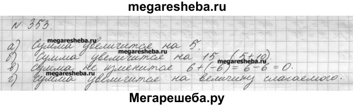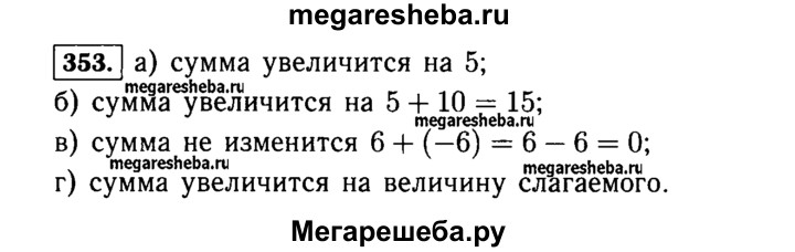 353. Как изменится сумма, если: а) одно из слагаемых увеличить на 5; б) одно слагаемое увеличить на 5, а второе — на 10; в) одно слагаемое увеличить на 6, а второе уменьшить на 6; г) одно из слагаемых увеличить вдвое?