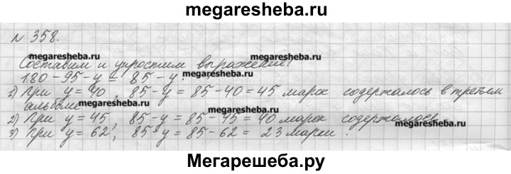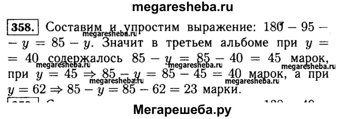 358. У Пети 180 марок в трёх альбомах. В одном альбоме 95 марок, а в другом у марок. Сколько марок у Пети в третьем альбоме? Составьте выражение для решения задачи и найдите его значение при у = 40; 45; 62.