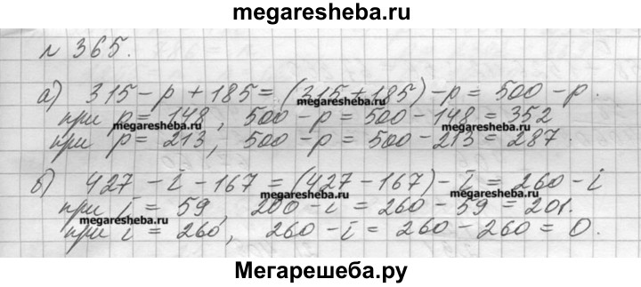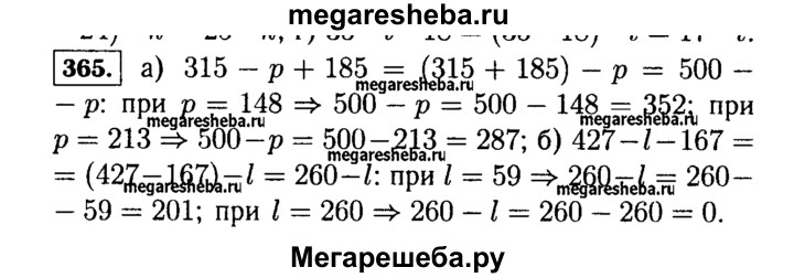 365. Упростите выражение и найдите его значение: а) 315 - р + 185 при р = 148; 213; б) 427 - I- 167 при I = 59; 260.