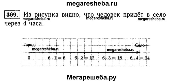 369. От города до села 24 км. Из города вышел человек и идёт со скоростью 6 км/ч. Изобразите на шкале расстояний (одно деление шкалы — 1 км) положение пешехода через 1 ч после выхода из города; через 2 ч; через 3 ч и т. д. Когда он придёт в село?