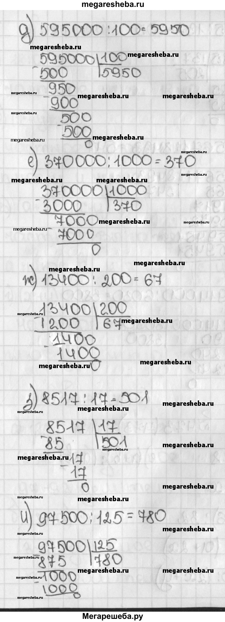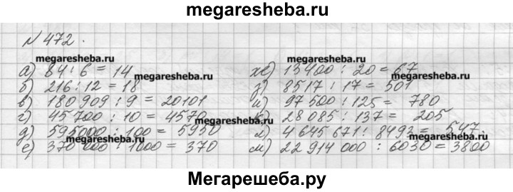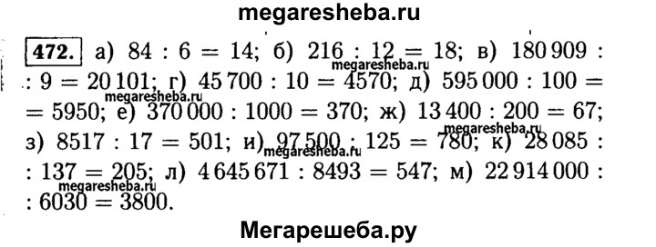 472. Выполните деление: а) 84 : 6; д) 595 000 : 100; и) 97 500 : 125; б) 216 : 12; е) 370 000 : 1000; к) 28 085 : 137; в) 180 909 : 9 ; ж) 13 400 : 200; л) 4 645 671 : 8493; г) 45 700 : 10 ; з) 8517 : 17; м) 22 914 000 : 6030.