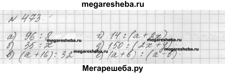 473. Запишите частное: а) 96 и 8; г) 14 и а + 2х; б) 35 и х; д) 150 и 2х + у; в) а + 16 и 32; е) a 4- Ь и а - Ь.