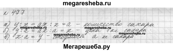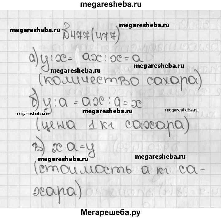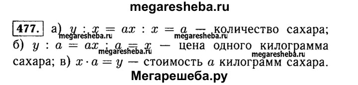 477. Пусть цена 1 кг сахара л: р., а стоимость а кг сахара у р. Что означает выражение: а) у : х; б) у : а; в) х * а?
