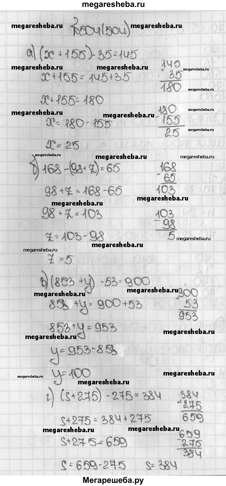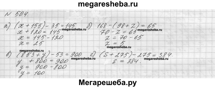 504. Решите уравнение: а) (х + 155) - 35 = 145; в) (853 + у) - 53 = 900; б) 168 - (98 + z) = 65; г) (s + 275) - 275 = 384.