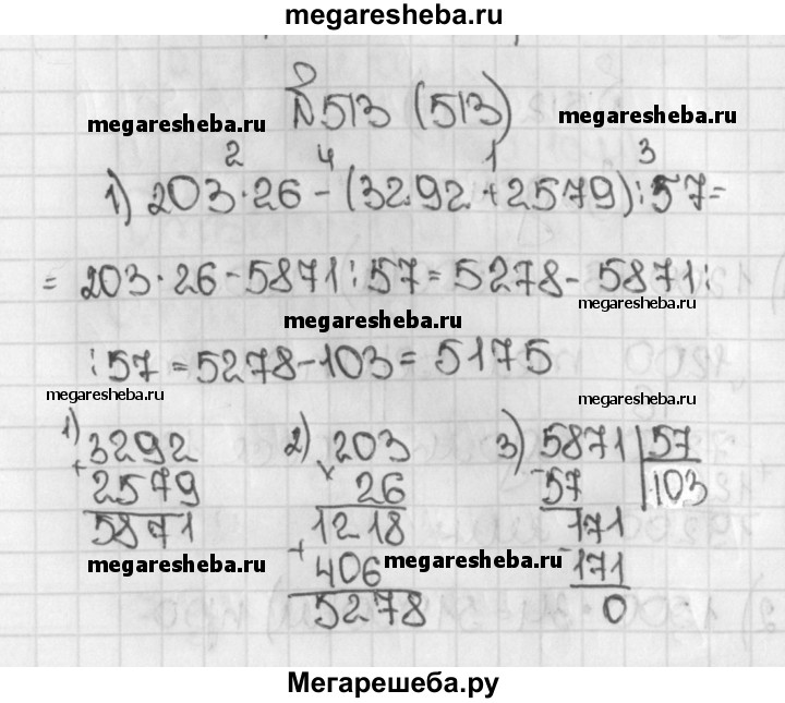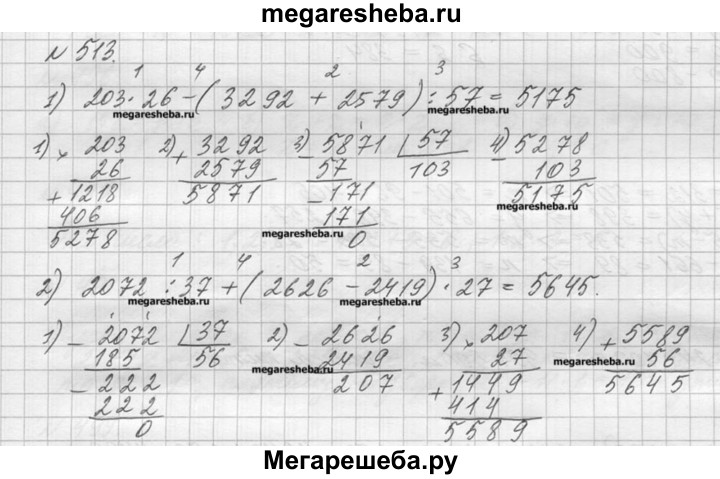 513. Выполните действия: 1) 203 * 26 - (3292 + 2579) : 57; 2) 2072 : 37 + (2626 - 2419) * 27.