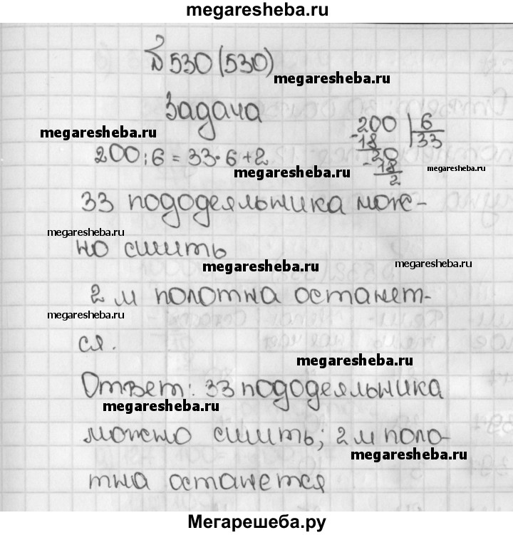 530. На пошив одного пододеяльника требуется 6 м полотна. Сколько пододеяльников можно сшить из 200 м полотна? Сколько полотна останется?