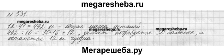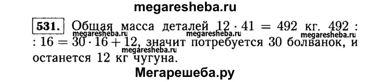 531. Масса чугунной болванки 16 кг. Сколько таких болванок потребуется для отливки 41 детали, каждая из которых имеет массу 12 кг? Сколько чугуна останется?