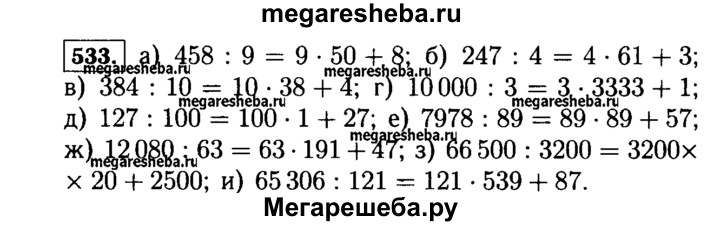 533. Выполните деление с остатком: а) 458 на 9; г) 10 000 на 3; ж) 12 080 на 63; б) 247 на 4; д) 127 на 100; з) 66 500 на 3200; в) 384 на 10; е) 7978 на 89; и) 65 306 на 121.