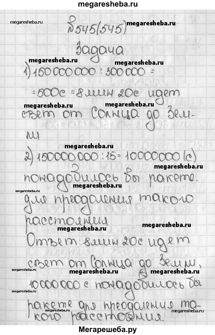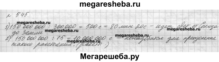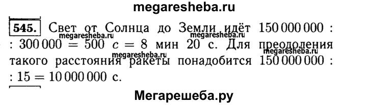 545. Расстояние от Земли до Солнца 150 млн км. Сколько времени идёт до Земли свет от Солнца, если за секунду он проходит 300 тыс. км? Сколько времени понадобилось бы ракете, чтобы преодолеть такое же расстояние, если её скорость 15 км/с?