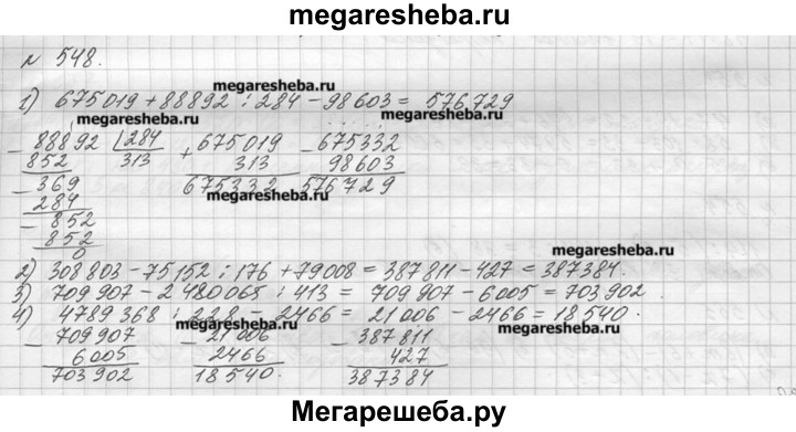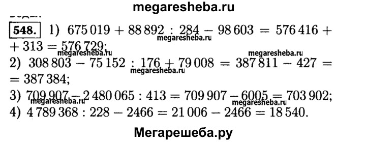 548. Найдите значение выражения: 1) 675 019 + 88 892 : 284 - 98 603; 2) 308 803 - 75 152 : 176 + 79 008; 3) 709 907 - 2 480 065 : 413; 4) 4 789 368 : 228 - 2466.