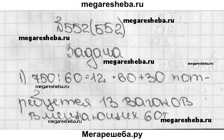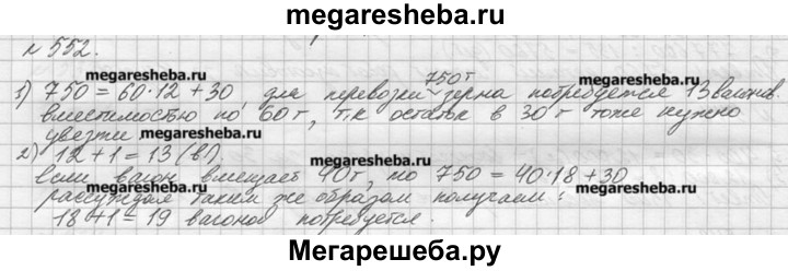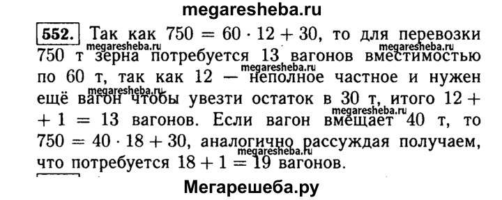 552. По железной дороге нужно перевезти 750 т зерна. Сколько для этого потребуется вагонов, вмещающих каждый по 60 т зерна? В скольких вагонах, вмещающих по 40 т, можно перевезти это же зерно?