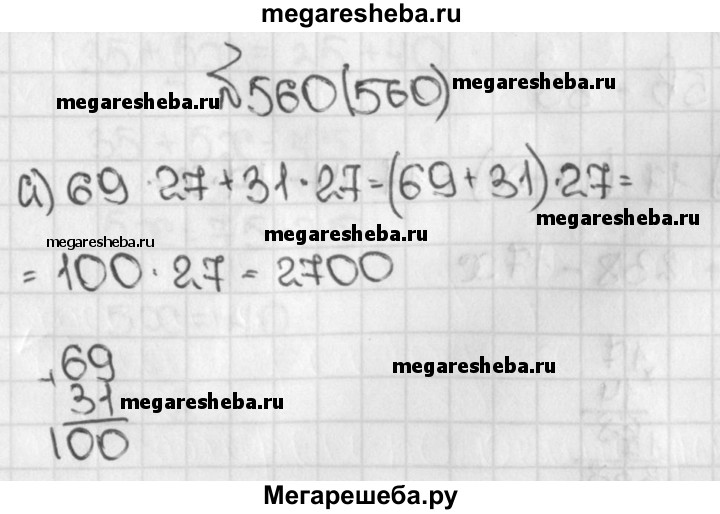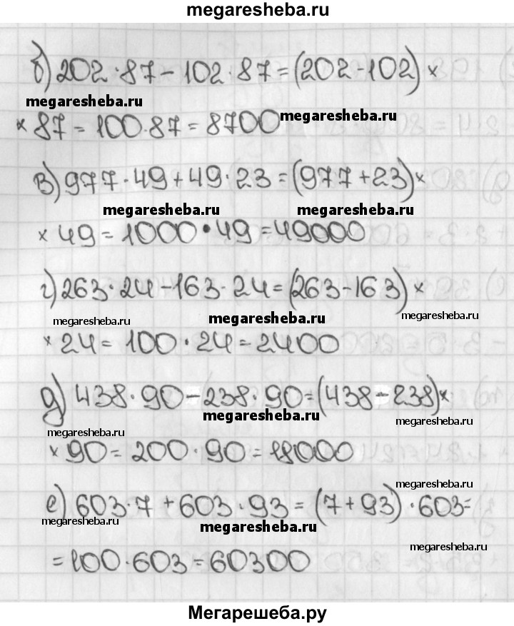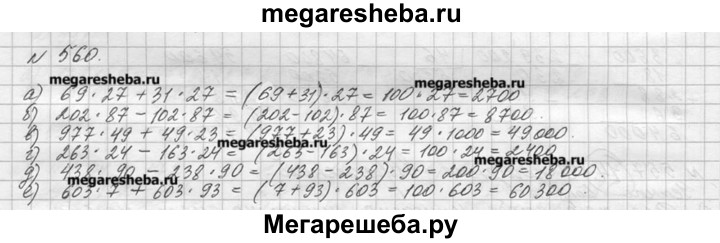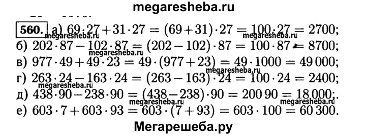 560. Найдите значение выражения: а) 69 * 27 + 31 * 27; г) 263*24-163*24; б) 202 * 87 - 102 * 87; д) 438*90-238*90; в) 977 *49 + 49 * 23; е) 603*7-603*93;