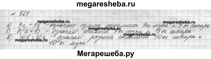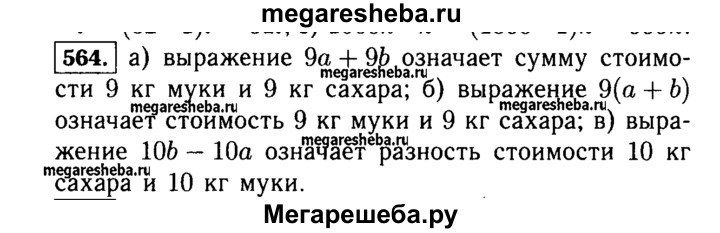 564. Пусть цена 1 кг муки а р., а цена 1 кг сахара b р. Что означает выражение: а) 9а + 9Ь; б) 9(а + Ь); в) 10Ь - 10а?